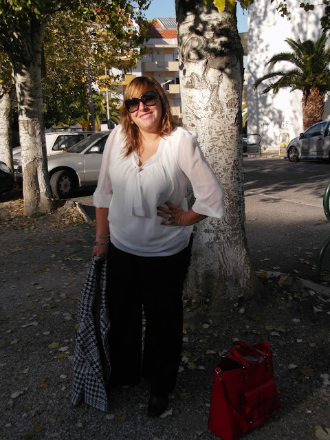 That's what happened in today's outfit: the elegancy of a classic black trousers (a must-have in every closet), contrasting with a white blouse and ending it up with the timeless pattern.